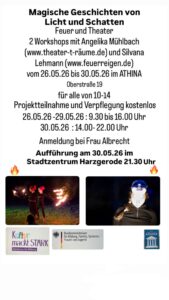 Das Feuertheater kann weiter gehen! In den Pfingstferien 2026, 2 Workshops mit Angelika Mühlbach und Silvana Lehmann. Projektteilnahme und Verpflegung sind kostenlos, für alle von 10-14 Jahren. Gefördert wird das Projekt durch das Programm „Kultur macht Stark“ und „Jep!“